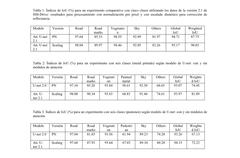 The results obtained with the new attention models on the HSI-Drive 2.1 data support both the incorporation of these new modules and the use of the pseudocorrection reflectance algorithm described above (dynamic scaling). With the incorporation of the attention modules, improvements in the most demanding classification indices (weighted IoU) of between 2% and 7% have been obtained, depending on the experiments and the number of classes to be identified. For their part, the segmentations obtained with the new dynamic scaling correction algorithm generate improvements of around 2% consistently in all the experiments carried out, with particular benefits in the classification of the most delicate classes due to their greater intraclass variability and lower interclass separability. Tables 1 to 3 show comparative test results according to the version of the database used (v2.0 or v2.1), the method applied in the treatment of reflectance values (PN or dynamic scaling), and the trained model (U-net or U-net with attention modules), both for an experiment with five classes (see segmentation example in Fig. 4) and in two experiments with six classes (see examples in Fig. 5).