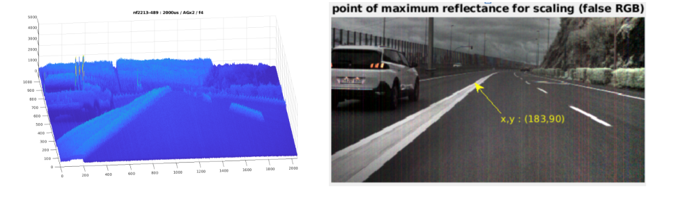 Reflectance correction is a particularly sensitive process, as its aim is to cancel out the illuminant’s irradiance spectrum and isolate the reflectance spectrum from it. In a laboratory setting, this can be done using a calibrated white tile and correcting the image data to be processed with data from a white reference image acquired under the same lighting conditions and with the same camera settings. Under dynamic field conditions, however, accurate reflectance correction is not possible. At GDED, we have developed a reflectance ‘pseudo-correction’ algorithm that improves data consistency by using data from the image itself to estimate the relative illumination levels of each scene. This estimation is performed dynamically or ‘on-the-fly’ by identifying the pixels with the highest albedo in each image, which usually correspond to high-reflectance white surfaces, typically road markings on asphalt or other reflective white paint, white-painted vehicle bodies, etc. By comparing the irradiance of these pixels with calibrated white reference images, a scale factor is calculated that allows for correction. Identifying reference pixels for scaling is not trivial, as it involves discarding pixels from artificial light sources (light emitters), such as traffic lights, traffic signals, or vehicle headlights and taillights. The implemented algorithm automatically segregates these ‘suspicious’ pixels based on their spectral signatures, requiring no human intervention and allowing this function to be integrated directly into the image processing pipeline of the segmentation processor (see example in Fig. 2). This new technique replaces the pixel normalisation (PN) used in previous versions of the HSI-Drive processing pipeline.