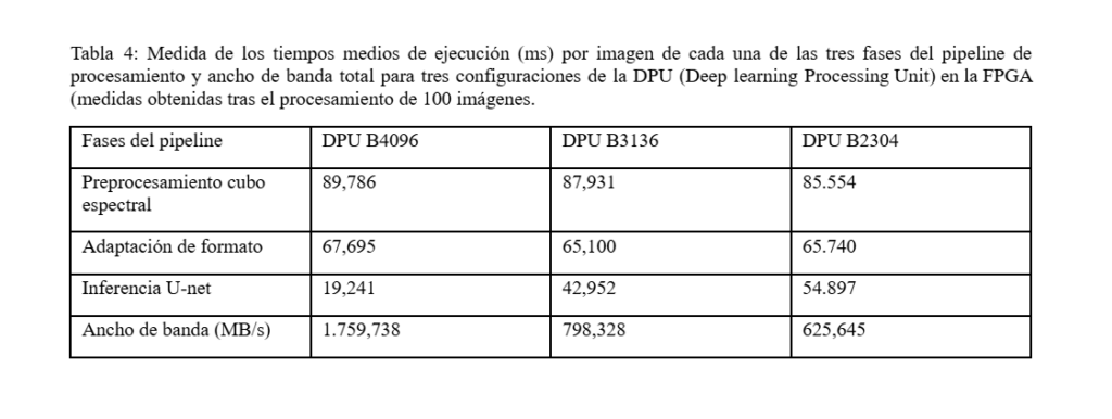 We have developed several prototypes with PSoC/FPGA technology for real-time processing of the HSI segmentation system, both for the pre-processing stage of sensor data (generation of hyperspectral cubes) and for CNN models for inference. One of the latest prototypes has been implemented on a low-power, low-cost AMD Kria KV26 SOM, suitable for embedding in mobile platforms. The processor performance characterisation values on this platform are shown in Table 4.