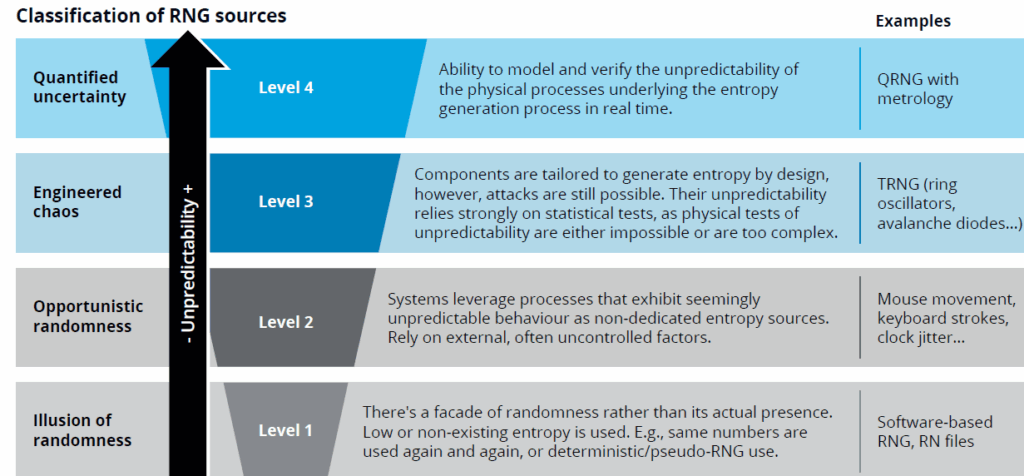– Nivel 4, incertidumbre cuantificada. Fuentes físicas dedicadas con modelado explícito de entropía, estimación en tiempo real y verificación continua. Es el estándar de oro para entornos de alta exigencia.